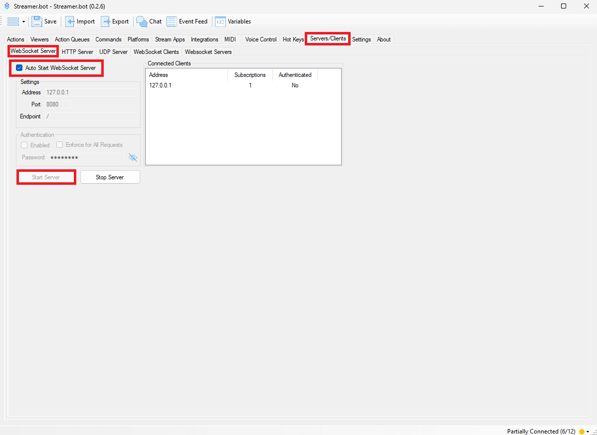 To enable the WebSocket Server, click on Servers/Clients, then WebSocket Server and ensure Auto Start WebSocket Server is checked (and if not already started, press Start Server).
